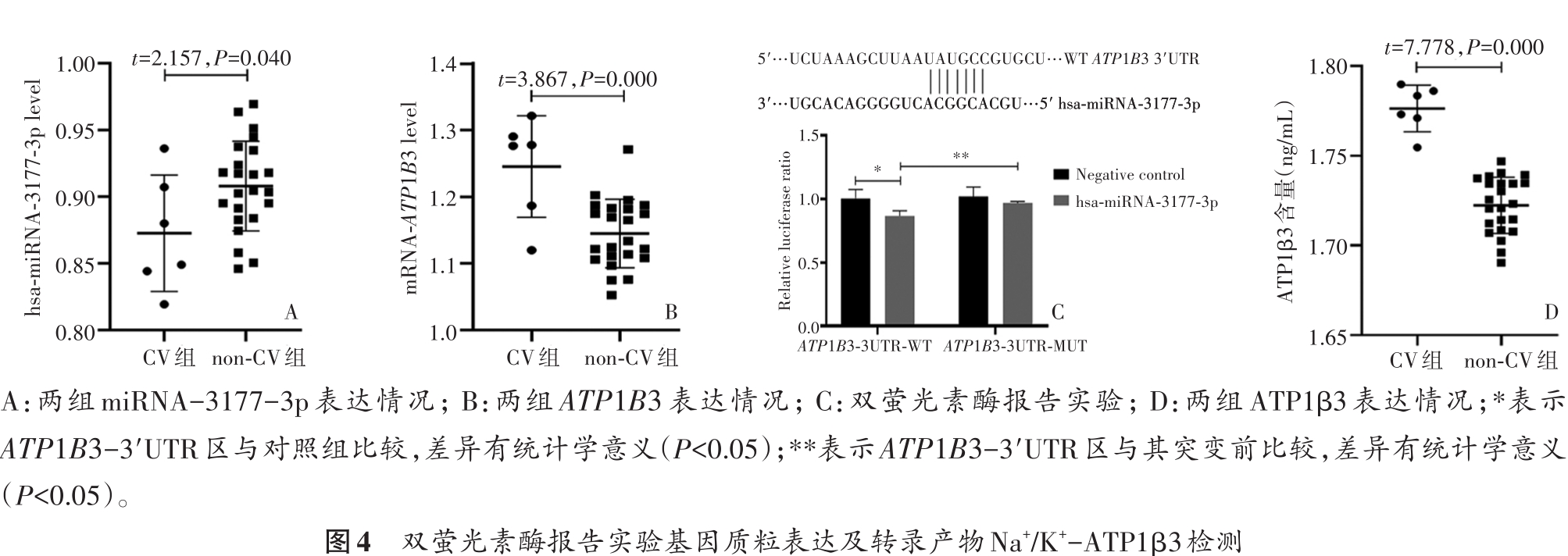 摘要:目的 测定动脉瘤性蛛网膜下腔出血(aSAH)后脑血管痉挛(CV)患者与脑血管未痉挛患者脑脊液中miRNA-3177-3p的表达情况,探讨其与CV的发病关系及临床意义。方法 将29例aSAH患者分成脑血管痉挛组(CV组)与脑血管未痉挛组(non-CV组)。比较两组患者的一般临床资料;通过生物信息数据分析确定miRNA-3177-3p作为研究对象,测定两组患者脑脊液中miRNA-3177-3p实际表达情况并比较差异;预测miRNA-3177-3p下游靶基因ATP1B3,构建ATP1B3质粒,双萤光素酶报告实验验证miRNA-3177-3p与ATP1B3靶向关系;最后,ELISA法测定两组患者脑脊液中ATP1B3转录产物ATP1β3含量并比较差异。结果 CV组患者Hunt评级高于non-CV组(P<0.05);CV组脑脊液中miRNA-3177-3p表达丰度为(0.873±0.044),与non-CV组(0.908±0.034)比较,差异有统计学意义(t=2.157,P=0.040);双萤光素酶报告实验结果显示,与miRNA-3177-3p作用后,ATP1B3-3′UTR区相较对照组活性降低15%(P<0.05);将ATP1B3-3′UTR区进行突变,ATP1B3-3′UTR区相较突变前活性上升14%(P<0.05);ELISA法证实表达产物ATP1β3在CV组脑脊液中(1.776±0.013)ng/mL高于non-CV组(1.722±0.016)ng/mL(t=7.778,P=0.000)。结论 CV患者脑脊液中miRNA-3177-3p表达下调,ATP1B3高表达可能参与了CV的发病过程,该机制可能在预测与治疗CV上具有一定临床意义。 [国际神经病学神经外科学杂志, 2023, 50(3): 6-11]