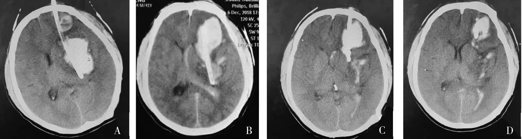 摘要:目的 探讨脑出血穿刺引流术后再出血脑疝患者的治疗方法及预后。方法 回顾分析2014年9月—2021年12月脑出血穿刺引流术后再出血脑疝15例患者的临床资料。结果 11例患者通过早期血肿抽吸及尿激酶溶解引流清除血肿,6个月后日常生活能力(ADL)分级,Ⅱ级4例,Ⅲ级6例,Ⅳ级1例,4例患者转为开颅血肿清除术及去骨瓣减压术,6个月后ADL分级,Ⅲ级2例,Ⅳ级1例,Ⅴ级1例。结论 早期血肿抽吸可以作为脑出血穿刺引流术后再出血脑疝患者的首选手段,病情不缓解再行开颅手术治疗。 [国际神经病学神经外科学杂志, 2023, 50(3): 12-15]