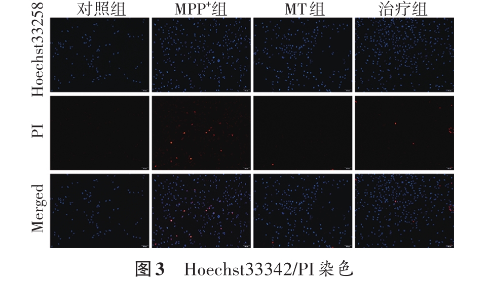 摘要:目的 探讨褪黑素(melatonin,MT)在1-甲基-4-苯基-吡啶离子(1-methyl-4-phenylpyridinium ion,MPP+)诱导的帕金森病体外模型中的作用及分子机制。方法 将MN9D细胞分为对照组、MPP+组、MT组、治疗组。采用细胞计数试剂盒8检测MT和MPP+对细胞活力的影响;采用线粒体膜电位检测试剂盒(JC-1)评价线粒体功能;Hoechst/PI双染法检测细胞凋亡;通过免疫荧光蛋白质印迹法(Western blotting)检测凋亡相关蛋白[Cleaved-Caspase 3和细胞色素C(cytochrome C,CytC)]以及泛醌―细胞色素C还原酶核心蛋白1(ubiquinol-cytochrome C reductase core protein 1,UQCRC1)蛋白的表达;采用干扰RNA技术沉默MN9D细胞中UQCRC1的表达,然后采用Western blotting检测凋亡相关蛋白表达。结果 MT可以减轻MPP+诱导的细胞活力下降(P<0.05);恢复MPP+造成的线粒体膜电位下降(P<0.05);减少MPP+诱导的凋亡细胞数量(P<0.05);抑制凋亡蛋白(CytC和Cleaved-Caspase3)的表达(P<0.05);上调UQCRC1的表达(P<0.05)。沉默UQCRC1后,MT组和治疗组的UQCRC1表达均下降(P<0.05);MT对MPP+诱导细胞凋亡的保护作用下降(P<0.05);凋亡蛋白(CytC和Cleaved-Caspase3)的表达增加(P<0.05)。结论 MT对 MPP+诱导的多巴胺能神经元损伤具有保护作用,其机制可能是通过上调UQCRC1抑制神经元凋亡。 [国际神经病学神经外科学杂志, 2023, 50(3): 26-31]